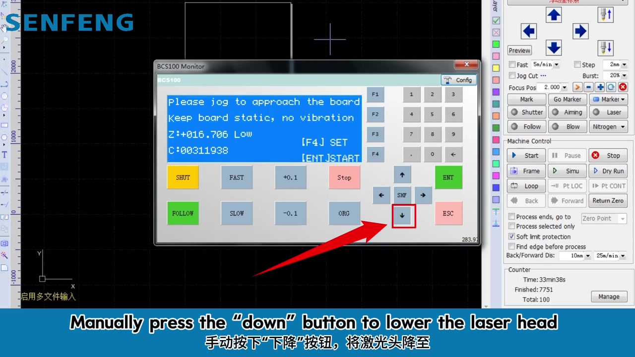 - Paso 4. Paso cuatro: pulse manualmente el botón de descenso para bajar el cabezal láser a aproximadamente 1 cm de la superficie de la pieza.
