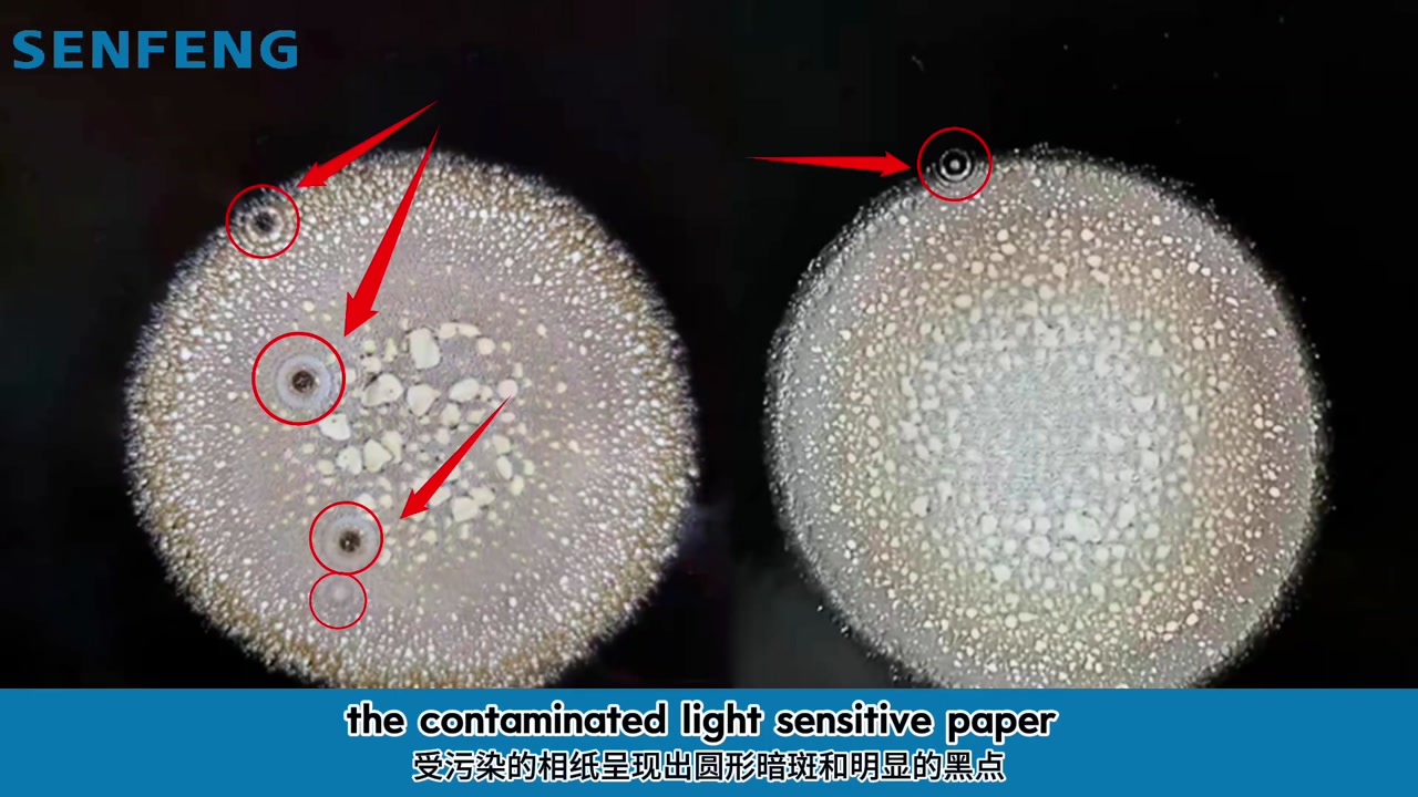 - Paso 19. El papel contaminado muestra manchas circulares oscuras y puntos negros.