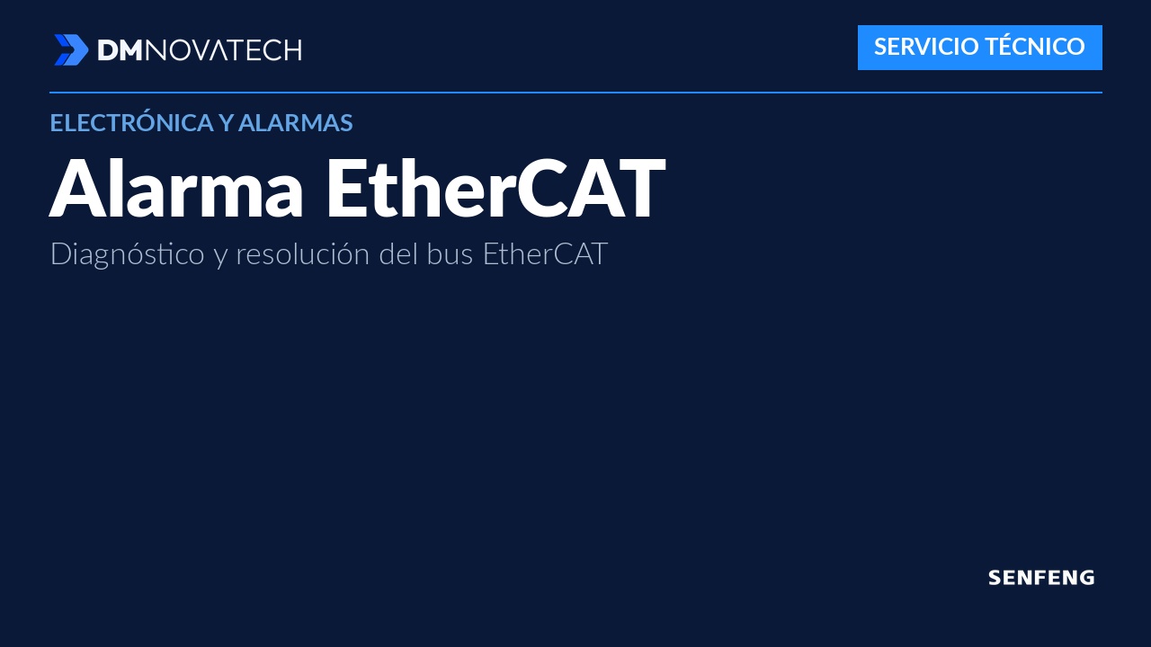La alarma EtherCAT indica un fallo en el bus de comunicación industrial que conecta la tarjeta de control con los servomotores y otros dispositivos de la máquina. Es una de las alarmas más importantes