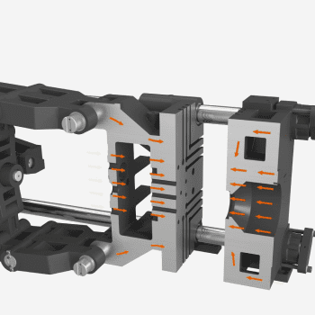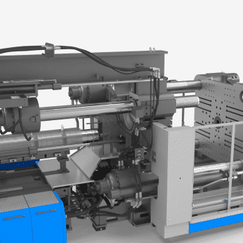 La combinación de alta presión y alta velocidad en el sistema hidráulico, junto con cilindros compactos para la apertura y cierre del molde y un mecanismo de baja fricción en los casquillos de las barras de unión de la placa móvil, permite una significativa reducción del tiempo de ciclo.